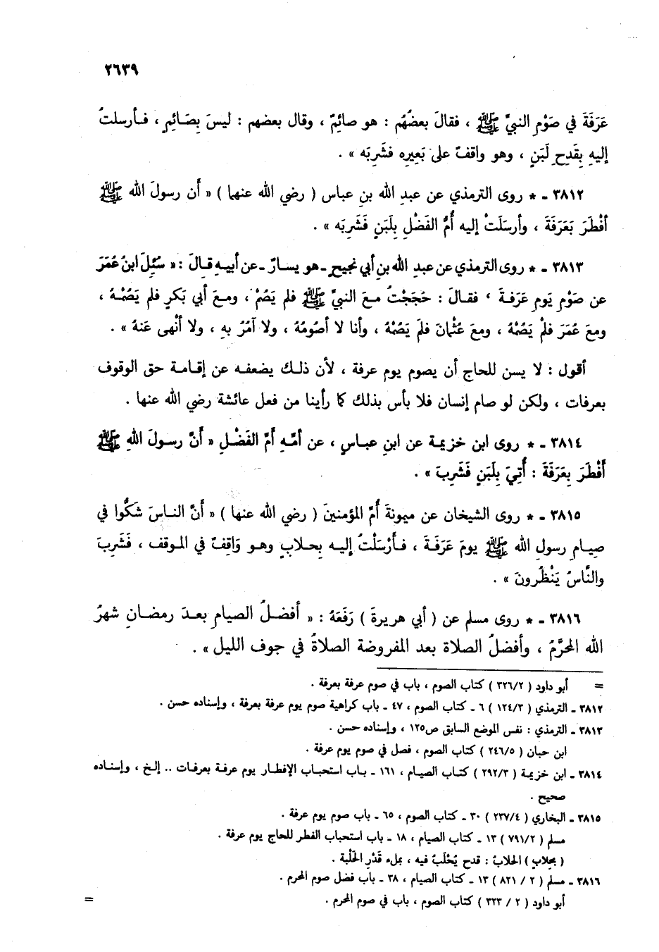 3814 - * روى ابن خزيمة عن ابن عباس، عن أمه أم الفضل "أن رسول الله صلى الله عليه وسلم أفطر بعرفة: أتي بلبن فشرب".
