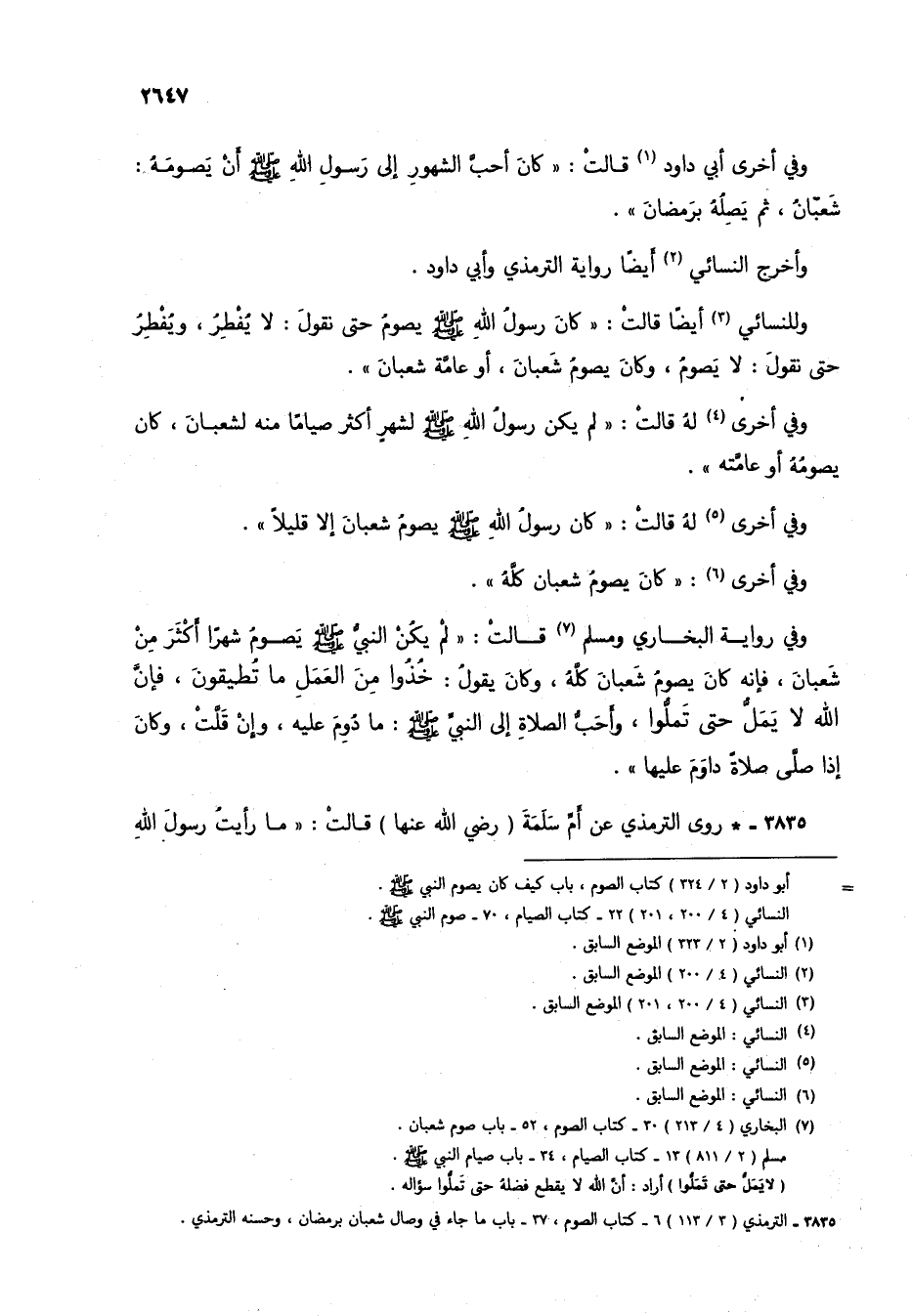 وللنسائي (3) أيضاً قالت: "كان رسول الله صلى الله عليه وسلم يصوم حتى نقول: لا يفطر، ويفطر حتى نقول: لا يصوم، وكان يصوم شعبان، أو عامة شعبان"ز