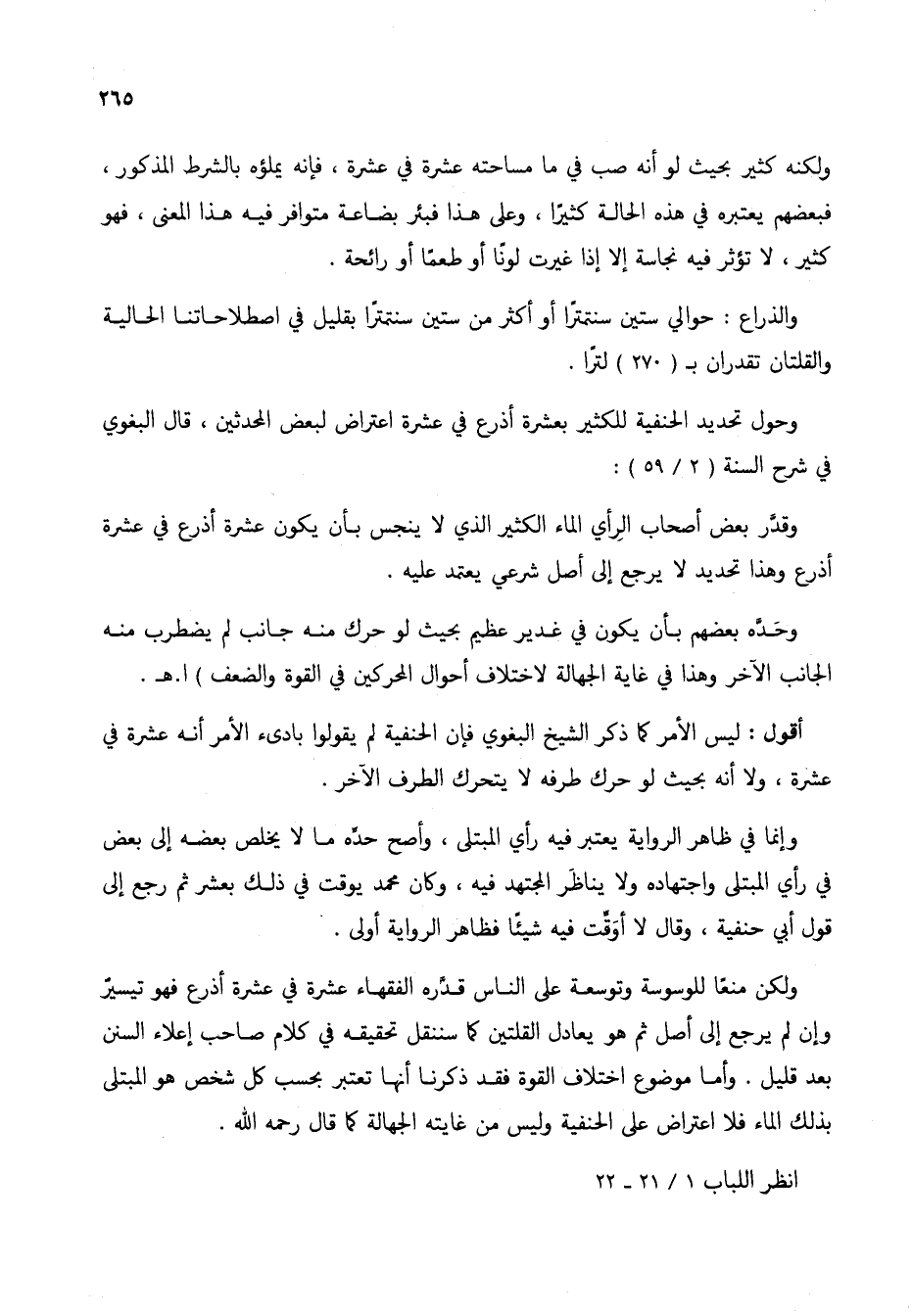 وحول تحديد الحنفية للكثير بعشرة أذرع في عشرة اعتراض لبعض المحدثين، قال البغوي في شرح السنة (2/ 59):