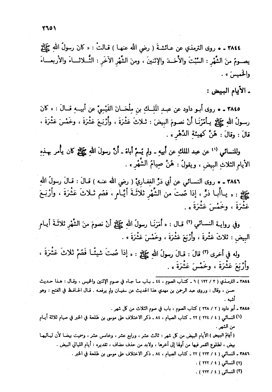 3845 - * روى أبو داود عن عبد الملك بن ملحان القيسي عن أبيه قال: "كان رسول الله صلى الله عليه وسلم يأمرنا أن نصوم البيض: ثلاث عشرة، وأربع عشرة، وخمس عشرة، قال: وقال: هن كهيئة الدهر".