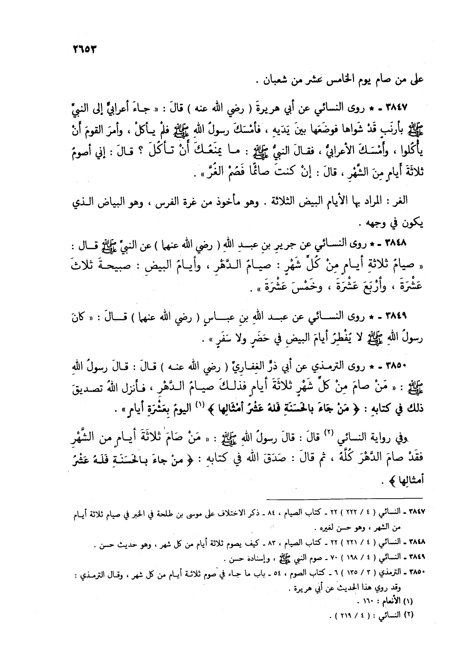 3849 - * روى النسائي عن عبد الله بن عباس (رضي الله عنهما) قال: "كان رسول الله صلى الله عليه وسلم لا يفطر أيام البيض في حضر ولا سفر".
