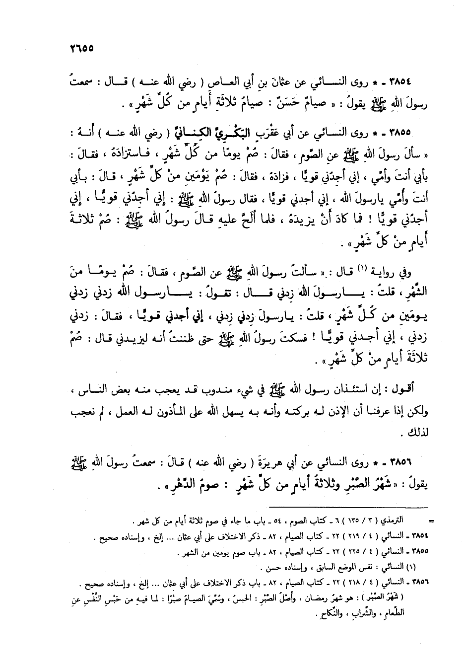 3855 - * روى النسائي عن أبي عقرب البكري الكناني (رضي الله عنه) أنه: "سأل رسول الله صلى الله عليه وسلم عن الصوم، فقال: صم يوماً من كل شهر، فاستزاده، فقال: بأبي أنت وأمي، إني أجدني قوياً، فزاده، فقال: صم يومين من كل شهر، قال: بأبي أنت وأمي يا رسول الله، إني أجدني قوياً، فقال رسول الله صلى الله عليه وسلم: إني أجدني قوياً، إني أجدني قوياً! فما كاد أن يزيده، فلما ألح عليه قال رسول الله صلى الله عليه وسلم: صم ثلاثة أيام من كل شهر.