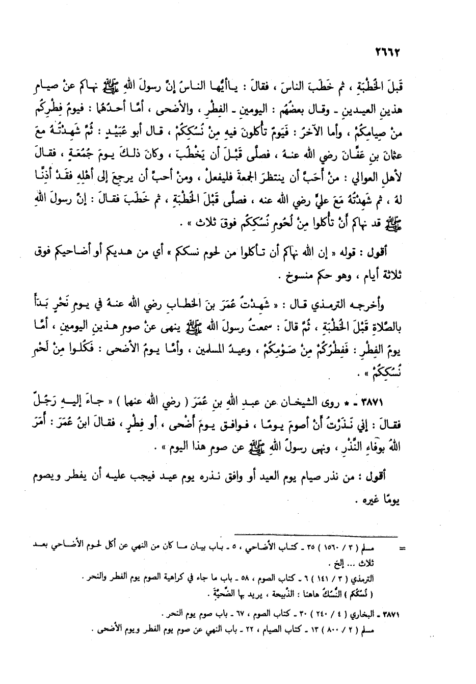 3871 - * روى الشيخان عن عبد الله بن عمر (رضي الله عنهما) "جاء إليه رجل فقال: إني نذرت أن أصوم يوماً، فوافق يوم أضحى، أو فطر، فقال ابن عمر: أمر الله بوفاء النذر، ونهى رسول الله صلى الله عليه وسلم عن صوم هذا اليوم".