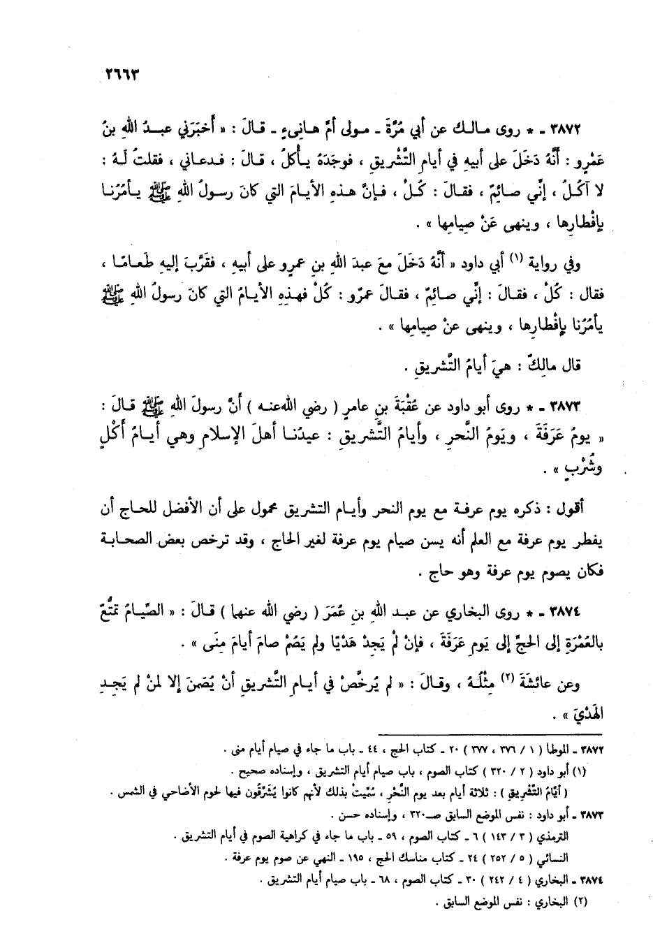 3873 - * روى أبو داود عن عقبة بن عامر (رضي الله عنه) أن رسول الله صلى الله عليه وسلم قال: "يوم عرفة، ويوم النحر، وأيام التشريق: عيدنا أهل الإسلام وهي أيام أكل وشرب".