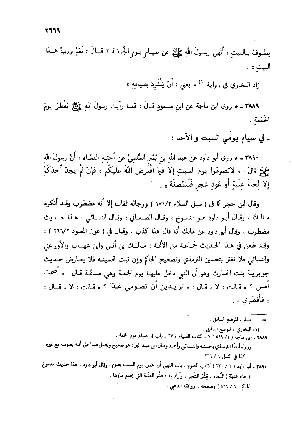 3890 - * روى أبو داود عن عبد الله بن بسر السلمي عن أخته الصماء: أن رسول الله صلى الله عليه وسلم قال: "لا تصوموا يوم السبت إلا فيما افترض الله عليكم، فإن لم يجد أحدكم إلا لحاء عنبة أو عود شجر فليمضغه".