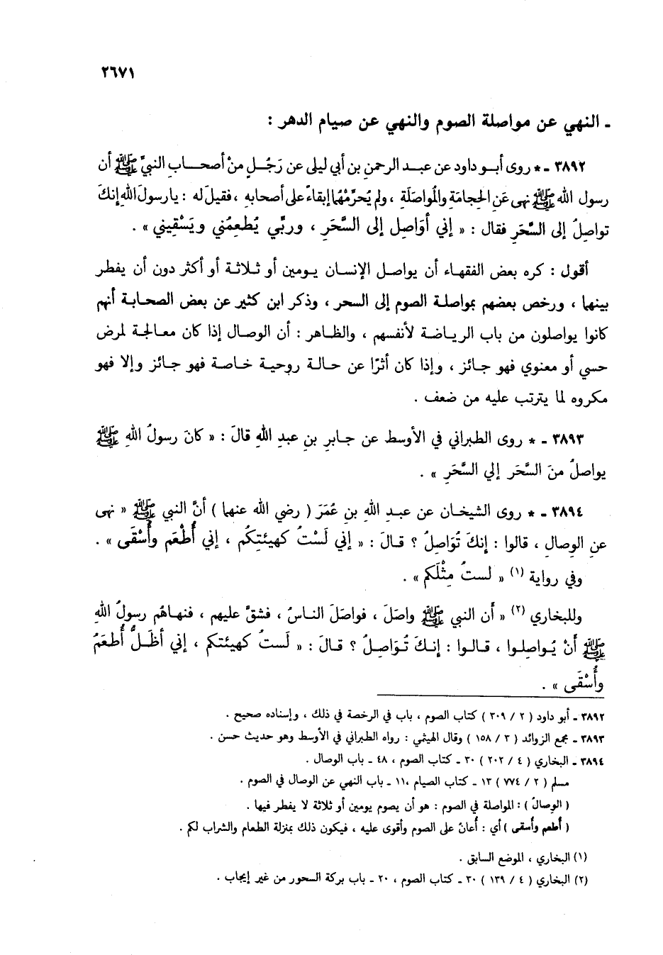3893 - * روى الطبراني في الأوسط عن جابر بن عبد الله قال: "كان رسول الله صلى الله عليه وسلم يواصل من السَّحَرَ إلي السَّحَرِ".