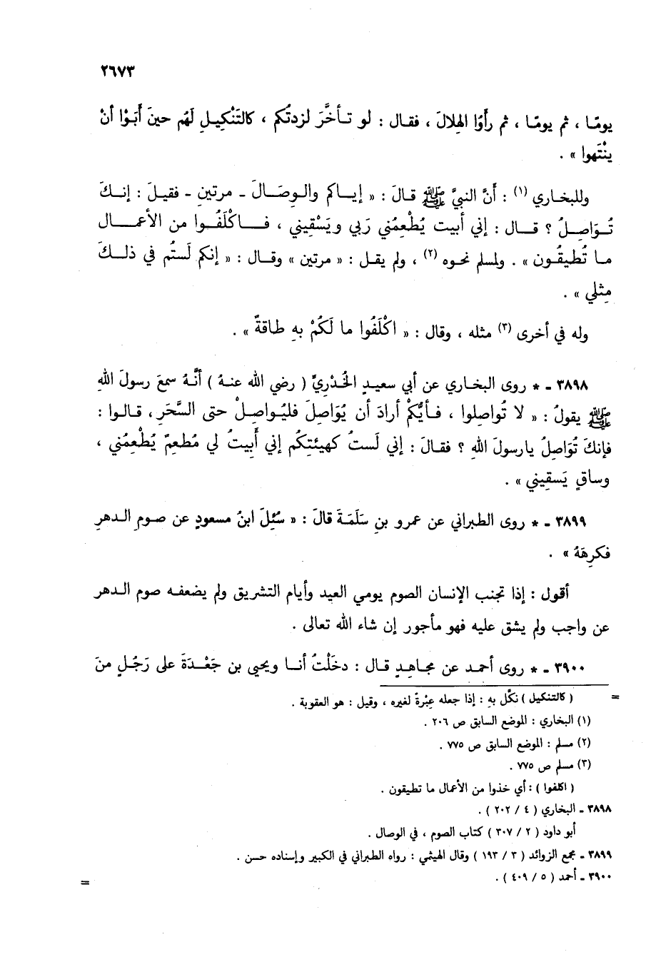 3898 - * روى البخاري عن أبي سعيد الخدري (رضي الله عنه) أنه سمع رسول الله صلى الله عليه وسلم يقول: "لا تواصلوا، فأيكم أراد أن يواصل فليواصل حتى السحر، قالوا: فإنك تواصل يا رسول الله؟ فقال: إني لست كهيئتكم إني أبيت لي مطعم يطعمني، وساق يسقيني".