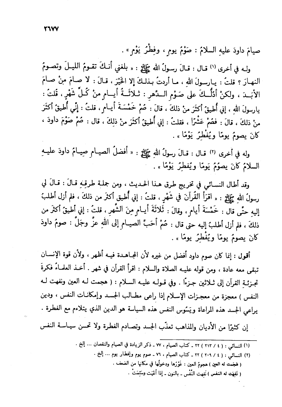 أقول: إنما كان صوم داود أفضل من غيره لأن المجاهدة فيه أظهر، ولأن قوة الإنسان تبقى معه عادة، ومن قوله عليه الصلاة والسلام: اقرأ القرآن في شهر. أخذ العلماء فكرة تجزئة القرآن على ثلاثين جزئاً. وفي قوله عليه السلام: (هجمت له العين ونفهت له النفس) معجزة من معجزات الإسلام إذا راعى مطالب الجسد وإمكانات النفس، ودين يراعي الجسد هذه المراعاة ويسوس النفس هذه السياسة هو الدين الذي يتلاءم مع الفطرة.