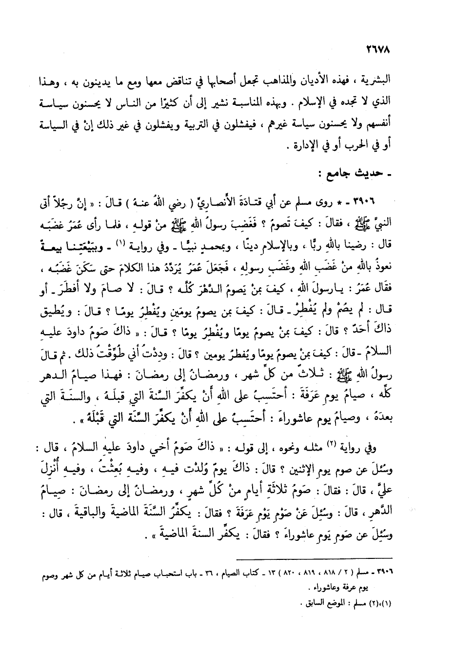 3906 - * روى مسلم عن أبي قتادة الأنصاري (رضي الله عنه) قال: "إن رجلاً أتى النبي صلى الله عليه وسلم، فقال: كيف تصوم؟ فغضب رسول الله صلى الله عليه وسلم من قوله، فلما رأى عمر غضبه قال: رضينا بالله رباً، وبالإسلام ديناً، وبمحمد نبياً- وفي رواية (1) - وببيعتنا بيعة نعوذ بالله من غضب الله وغضب رسوله، فجعل عمر يردد هذا الكلام حتى سكن غضبه، فقال عمر: يا رسول الله، كيف بمن يصوم الدهر كله؟ قال: لا صام ولا أفطر- أو قال: لم يصم ولم يفطر- قال: كيف بمن يصوم يومين ويفطر يوماً؟ قال: ويطيق ذاك أحد؟ قال: كيف بمن يصوم يوماً ويفطر يوماً؟ قال: "ذاك صوم داود عليه السلام- قال: كيف بمن يصوم يوماً ويفطر يومين؟ قال: وددت أني طوقت ذلك. ثم قال رسول الله صلى الله عليه وسلم: ثلاث من كل شهر، ورمضان إلى رمضان: فهذا صيام الدهر كله، صيام يوم عرفة: أحتسب على الله أن يكفر السنة التي قبله، والسنة التي بعده، وصيام يوم عاشوراء: أحتسب على الله أن يكفر السنة التي قبله".