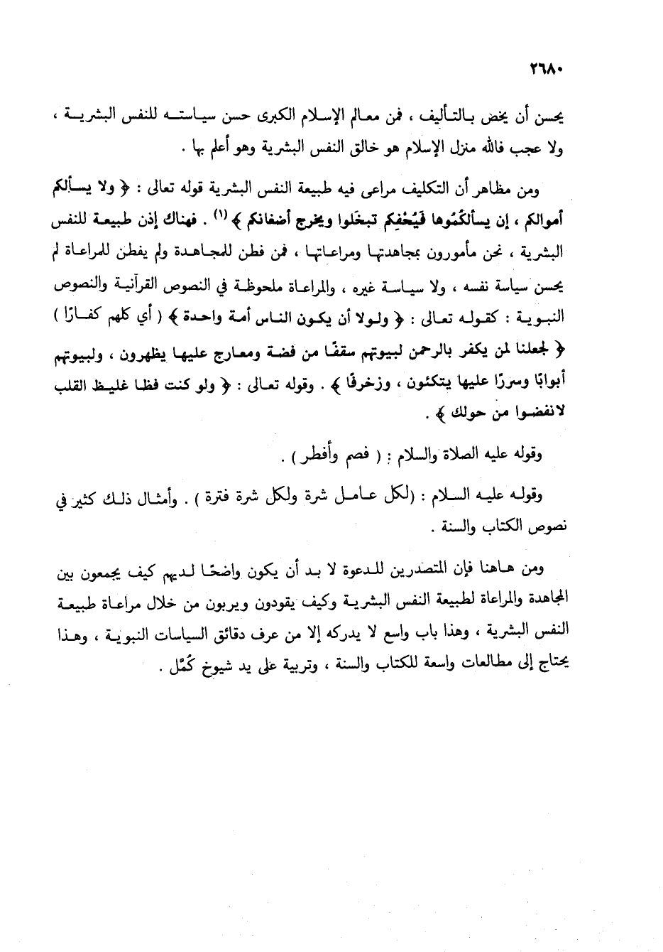 ومن مظاهر أن التكليف مراعى فيه طبيعة النفس البشرية قوله تعالى: {وَلَا يَسْأَلْكُمْ أَمْوَالَكُمْ، إِنْ يَسْأَلْكُمُوهَا فَيُحْفِكُمْ تَبْخَلُوا وَيُخْرِجْ أَضْغَانَكُمْ} (1). فهناك إذن طبيعة للنفس البشرية، نحن مأمورون بمجاهدتها ومراعاتها، فمن فطن للمجاهدة ولم يفطن للمراعاة لم يحسن سياسة نفسه، ولا سياسة غيره، والمراعاة ملحوظة في النصوص القرآنية والنصوص النبوية: كقوله تعالى: {وَلَوْلَا أَنْ يَكُونَ النَّاسُ أُمَّةً وَاحِدَةً} (أي كلهم كفاراً) {لَجَعَلْنَا لِمَنْ يَكْفُرُ بِالرَّحْمَنِ لِبُيُوتِهِمْ سُقُفًا مِنْ فِضَّةٍ وَمَعَارِجَ عَلَيْهَا يَظْهَرُونَ، وَلِبُيُوتِهِمْ أَبْوَابًا وَسُرُرًا عَلَيْهَا يَتَّكِئُونَ، وَزُخْرُفًا}. وقوله تعالى: {وَلَوْ كُنْتَ فَظًّا غَلِيظَ الْقَلْبِ لَانْفَضُّوا مِنْ حَوْلِكَ}.