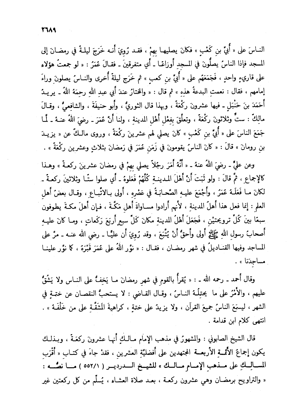 الناس على "أبي بن كعب" فكان يصليها بهم، فقد روي أنه خرج ليلة في رمضان إلى المسجد فإذا الناس يصلون في المسجد أوزاعاً- أي متفرقين- فقال عمر: "لو جمعت هؤلاء على قارئ واحد، فجمعهم على "أبي بن كعب" ثم خرج ليلة أخرى والناس يصلون وراء إمامهم، فقال: نعمت البدعة هذه" ثم قال: "والمختار عند أبي عبد الله رحمه الله- يريد أحمد بن حنبل- فيها عشرون ركعة، وبهذا قال الثوري، وأبو حنيفة، والشافعي، وقال مالك: ست وثلاثون ركعة، وتعلق بفعل أهل المدينة، ولنا أن عمر- رضي الله عنه- لما جمع الناس على "أبي بن كعب" كان يصلي لهم عشرين ركعة، وروى مالك عن "يزيد بن رومان" قال: "كان الناس يقومون في زمن عمر في رمضان بثلاث وعشرين ركعة".