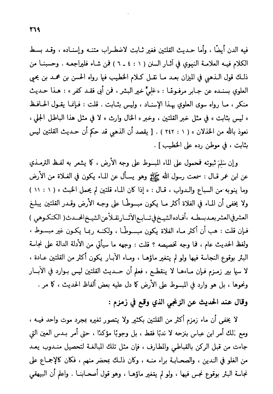 فيه الدن أيضاً، وأما حديث القلتين فغير ثابت لاضطراب متنه وإسناده، وقد بسط الكلام فيه العلامة النيموي في آثار السنن (1: 4 - 6) فمن شاء فليراجعه. وحسبنا من ذلك قول الذهبي في الميزان بعد ما نقل كلام الخطيب فيما رواه الحسن بن محمد بن يحيى العلوي بسنده عن جابر مرفوعاً: "عليُّ خير البشر، فمن أبي فقد كفر": هذا حديث منكر، ما رواه سوى العلوي بهذا الإسناد، وليس بثابت. قلت: فإنما يقول الحافظ "ليس بثابت" في مثل خبر القلتين، وخبر "الخال وارث" لا في مثل هذا الباطل الجلي، نعوذ بالله من الخذلان" (1: 242). [يقصد أن الذهبي قد حكم أن حديث القلتين ليس بثابت، في موطن رده على الخطيب].