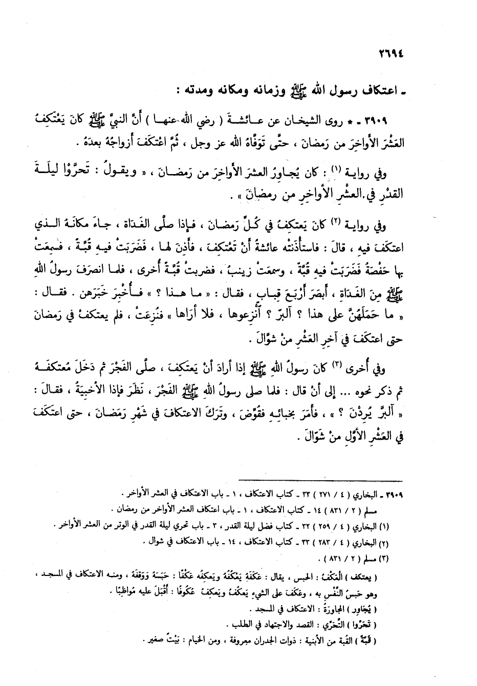 3909 - * روى الشيخان عن عائشة (رضي الله عنها) أن النبي صلى الله عليه وسلم كان يعتكف العشر الأواخر من رمضان، حتى توفاه الله عز وجل، ثم اعتكف أزواجه بعده.