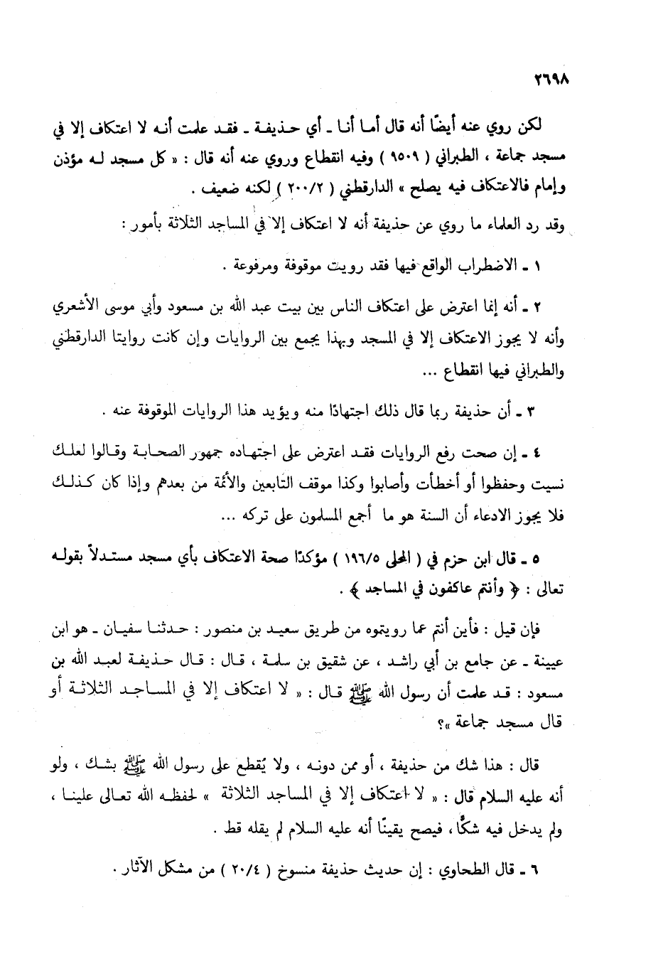 قال: هذا شك من حذيفة، أو ممن دونه، ولا يقطع على رسول الله صلى الله عليه وسلم بشك، ولو أنه عليه السلام قال: "لا اعتكاف إلا في المساجد الثلاثة" لحفظه الله تعالى علينا، ولم يدخل فيه شكاً، فيصح يقيناً أنه عليه السلام لم يقله قط.