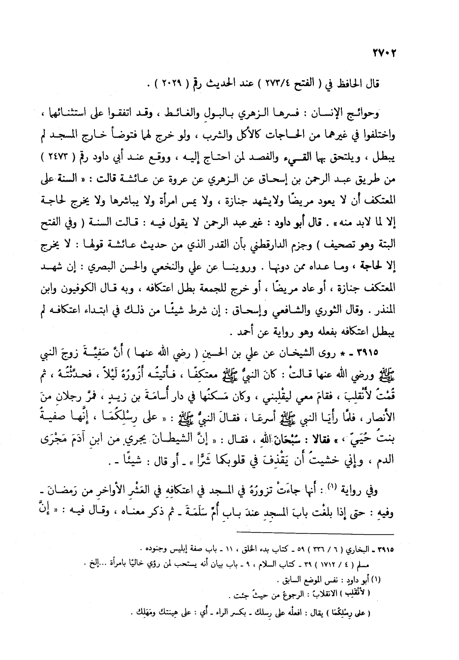 وحوائج الإنسان: فسرها الزهري بالبول والغائط، وقد اتفقوا على استثنائهما، واختلفوا في غيرهما من الحاجات كالأكل والشرب، ولو خرج لهما فتوضأ خارج المسجد لم يبطل، ويلتحق بهما القيء والفصد لمن احتاج إليه، ووقع عند أبي داود رقم (2473) من طريق عبد الرحمن بن إسحاق عن الزهري عن عروة عن عائشة قالت: "السنة على المعتكف أن لا يعود مريضاً ولا يشهد جنازة، ولا يمس امرأة ولا يباشرها ولا يخرج لحاجة إلا لما لابد منه". قال أبو داود: غير عبد الرحمن لا يقول فيه: قالت السنة (وفي الفتح البتة وهو تصحيف) وجزم الدارقطني بأن القدر الذي من حديث عائشة قولها: لا يخرج إلا لحاجة، وما عداه ممن دونها. وروينا عن علي والنخعي والحسن البصري: إن شهد المعتكف جنازة، أو عاد مريضاً، أو خرج للجمعة بطل اعتكافه، وبه قال الكوفيون وابن المنذر. وقال الثوري والشافعي وإسحاق: إن شرط شيئاً من ذلك في ابتداء اعتكافه لم يبطل اعتكافه بفعله وهو رواية عن أحمد.