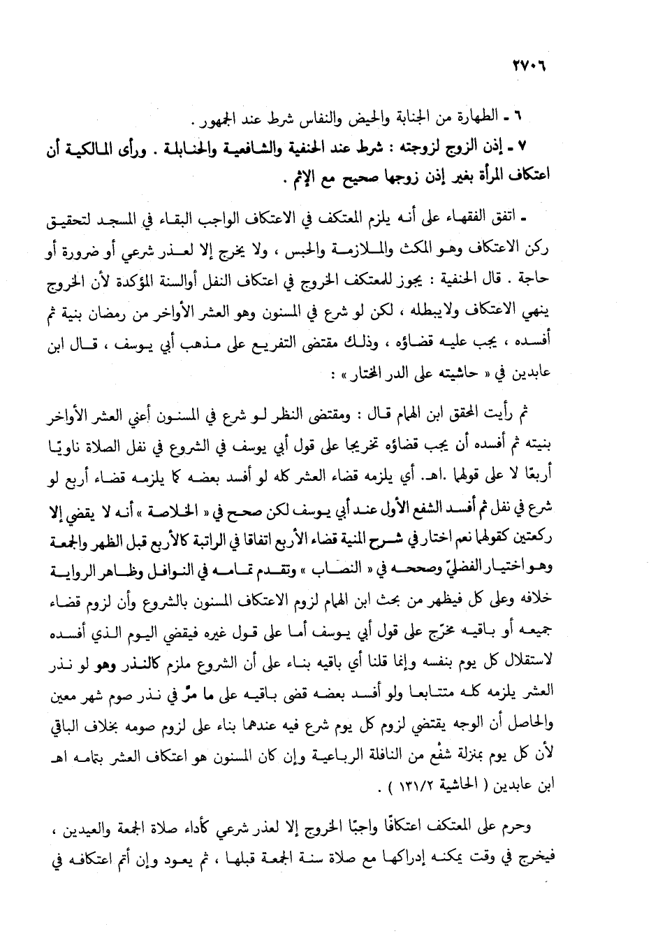 7 - إذن الزوج لزوجته: شرط عند الحنفية والشافعية والحنابلة. ورأى المالكية أن اعتكاف المرأة بغير إذن زوجها صحيح مع الإثم.