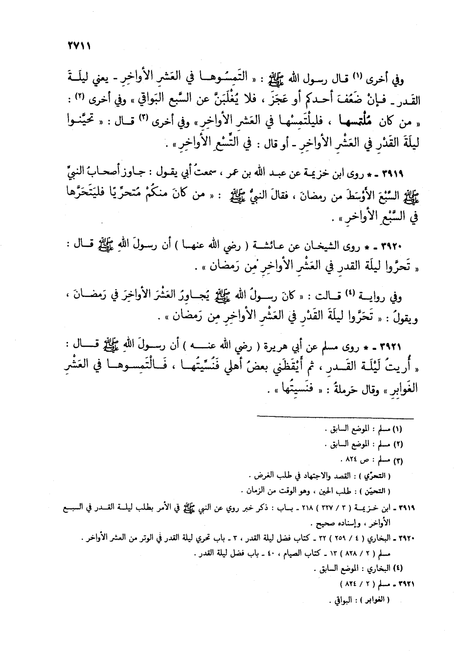 3921 - * روى مسلم عن أبي هريرة (رضي الله عنه) أن رسول الله صلى الله عليه وسلم قال: "أريت ليلة القدر، ثم أيقظني بعض أهلي فنسيتها، فالتمسوها في العشر الغوابر" وقال حرملة: "فنسيتها".