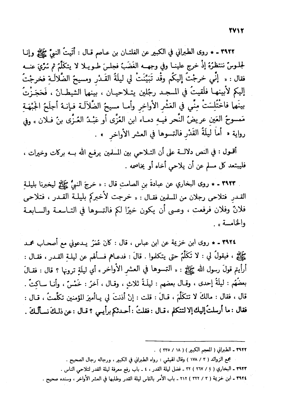 3922 - * روى الطبراني في الكبير عن الفلتان بن عاصم قال: أتيت النبي صلى الله عليه وسلم وإنا لجلوس ننتظره إذ خرج علينا وفي وجهه الغضب فجلس طويلاً لا يتكلم ثم سري عنه فقال: "إني خرجت إليكم وقد تبينت لي ليلة القدر ومسيح الضلالة فخرجت إليكم لأبينها فلقيت في المسجد رجلين يتلاحيان، بينهما الشيطان، فحجزت بينهما فاختلست مني في العشر الأواخر وأما مسيح الضلالة فإنه أجلح الجبهة ممسوح العين عريض النحر فيه دماء ابن العزى أو عبد العزى بن فلان" وفي رواية "أما ليلة القدر فالتمسوها في العشر الأواخر".