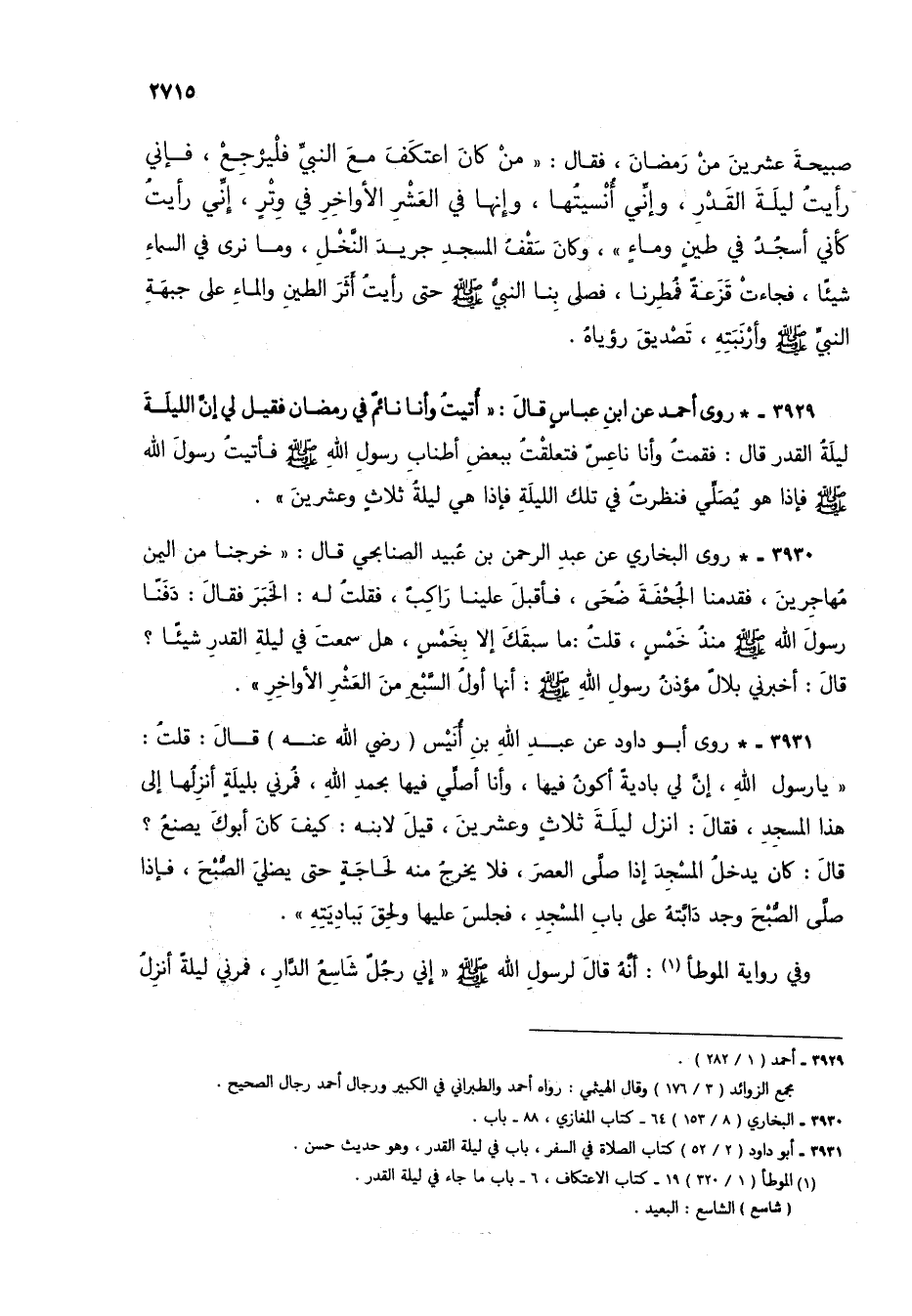 3929 - * روى أحمد عن ابن عباس قال: "أتيت وأنا نائم في رمضان فقيل لي إن الليلة ليلة القدر قال: فقمت وأنا ناعس فتعلقت ببعض أطناب رسول الله صلى الله عليه وسلم فأتيت رسول الله صلى الله عليه وسلم فإذا هو يصلي فنظرت في تلك الليلة فإذا هي ليلة ثلاث وعشرين".