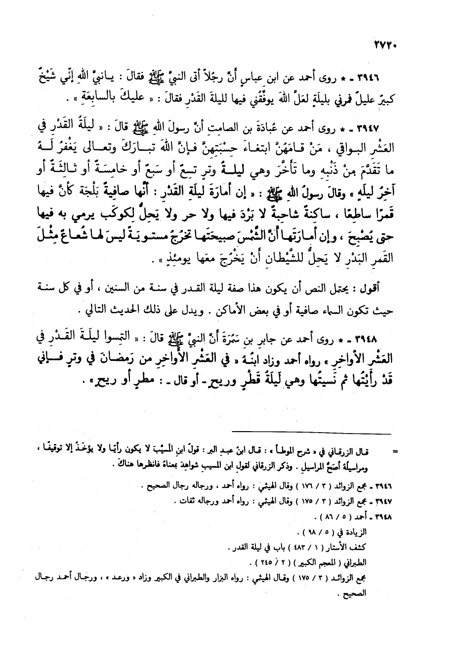 3946 - * روى أحمد عن ابن عباس أن رجلاً أتى النبي صلى الله عليه وسلم فقال: يا نبي الله إني شيخ كبير عليل فمرني بليلة لعل الله يوفقني فيها لليلة القدر فقال: "عليك بالسابعة".