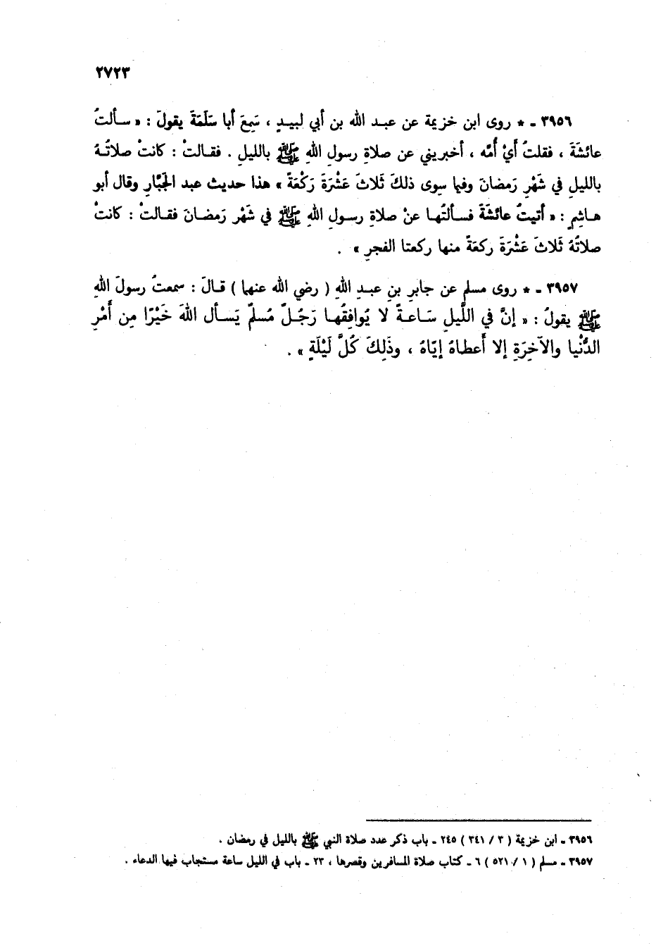 3956 - * روى ابن خزيمة عن عبد الله بن أبي لبيد، سمع أبا سلمة يقول: "سألت عائشة، فقلت أي أمه، أخبريني عن صلاة رسول الله صلى الله عليه وسلم بالليل. فقالت: كانت صلاته بالليل في شهر رمضان وفيما سوى ذلك ثلاث عشرة ركعة" هذا حديث عبد الجبار وقال أبو هاشم: "أتيت عائشة فسألتها عن صلاة رسول الله صلى الله عليه وسلم في شهر رمضان فقالت: كانت صلاته ثلاث عشرة ركعة منها ركعتا الفجر".