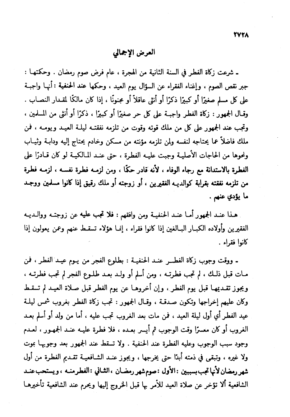 - شرعت زكاة الفطر في السنة الثانية من الهجرة، عام فرض صوم رمضان. وحكمتها: جبر نقص الصوم، وإغناء الفقراء عن السؤال يوم العيد، وحكمها عند الحنفية: أنها واجبة على كل مسلم صغيراً أو كبيراً ذكراً أو أنثى عاقلاً أو مجنوناً، إذا كان مالكاً لمقدار النصاب. وقال الجمهور: زكاة الفطر واجبة على كل حر صغيراً أو كبيراً، ذكراً أو أنثى من المسلمين، وتجب عند الجمهور على كل من ملك قوته وقوت من تلزمه نفقته ليلة العيد ويومه، فمن ملك فاضلاً عما يحتاجه لنفسه ولمن تلزمه مؤنته من مسكن وخادم يحتاج إليه ودابة وثياب ونحوها من الحاجات الأصلية وجبت عليه الفطرة، حتى عند المالكية لو كان قادراً على الفطرة بالاستدانة مع رجاء الوفاء، لأنه قادر حكماً، ومن لزمه فطرة نفسه، لزمه فطرة من تلزمه نفقته بقرابة كوالديه الفقيرين، أو زوجته أو ملك رقيق إذا كانوا مسلمين ووجد ما يؤدي عنهم.