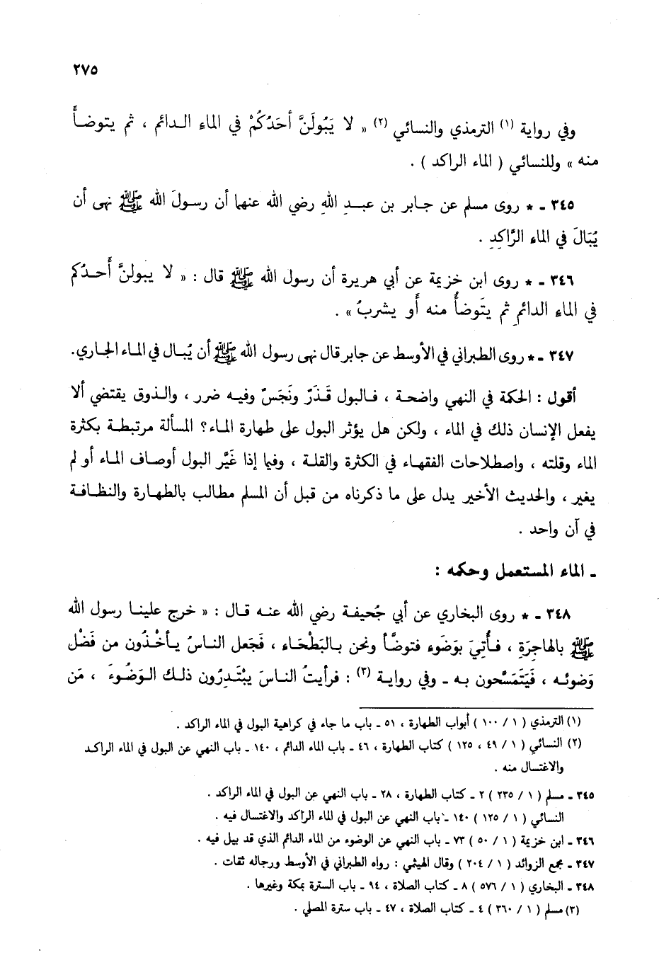 346 - * روى ابن خزيمة عن أبي هريرة أن رسول الله صلى الله عليه وسلم قال: "لا يبولنَّ أحدُكم في الماء الدائم ثم يتوضأُ منه أو يشربُ".