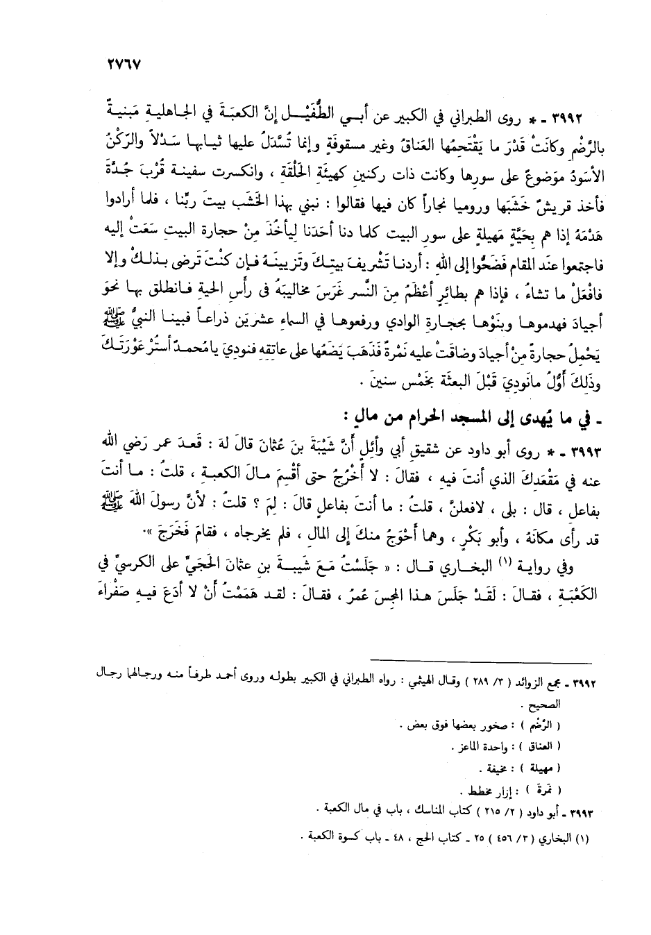 3992 - * روى الطبراني في الكبير عن أبي الطفيل إن الكعبة في الجاهلية مبنية بالرضم وكانت قدر ما يقتحمها العناق وغير مسقوفة وإنما تسدل عليها ثيابها سدلاً والركن الأسود موضوع على سورها وكانت ذات ركنين كهيئة الحلقة، وانكسرت سفينة قرب جدة فأخذ قريش خشبها وروميا ناراً كان فيها فقالوا: نبني بهذا الخشب بيت ربنا، فلما أرادوا هدمه إذا هم بحية مهيلة على سور البيت كلما دنا أحدنا ليأخذ من حجارة البيت سعت إليه فاجتمعوا عند المقام فضحوا إلى الله: أردنا تشريف بيتك وتزيينه فإن كنت ترضى بذلك وإلا فافعل ما تشاء، فإذا هم بطائر أعظم من النسر غرس مخاليبه في رأس الحية فانطلق بها نحو أجياد فهدموها وبنوها بحجارة الوادي ورفعوها في السماء عشرين ذراعاً فبينا النبي صلى الله عليه وسلم يحمل حجارة من أجياد وضاقت عليه نمرة فذهب يضعها على عاتقه فنودي يا محمد أستر عورتك وذلك أول ما نودي قبل البعثة بخمس سنين.