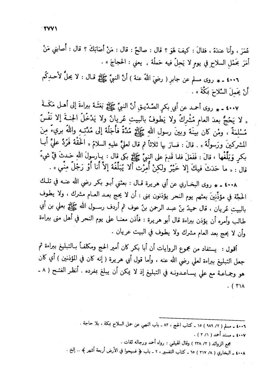 4007 - * روى أحمد عن أبي بكر الصديق أن النبي صلى الله عليه وسلم بعثه ببراءة إلى أهل مكة "لا يحج بعد العام مشرك ولا يطوف بالبيت عريان ولا يدخل الجنة إلا نفس مسلمة، ومن كان بينه وبين رسول الله صلى الله عليه وسلم مدة فأجله إلى مدته والله بريء من المشركين ورسوله". قال: فسار بها ثلاثاً ثم قال لعلي عليه السلام "الحقه فرد علي أبا بكر وبلغها، قال: ففعل فلما قدم على النبي صلى الله عليه وسلم بكى قال: يا رسول الله حدث في شيء قال: "ما حدث فيك إلا خير ولكن أمرت ألا يبلغه إلا أنا أو رجل مني".