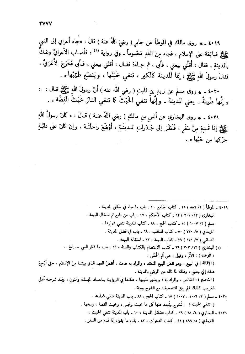 4019 - * روى مالك في الموطأ عن جابر (رضي الله عنه) قال: "جاء أعرابي إلى النبي صلى الله عليه وسلم فبايعه على الإسلام، فجاء من الغد محموماً- وفي رواية (1): فأصاب الأعرابي وعك بالمدينة- فقال: أقلني بيعتي، فأبى، ثم جاءه فقال: أقلني بيعتي، فأبى فخرج الأعرابي، فقال رسول الله صلى الله عليه وسلم: إنما المدينة كالكير، تنفي خبثها، وينصع طيبها".