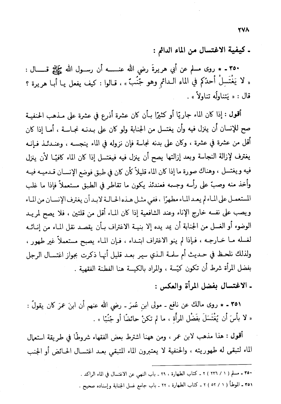 350 - * روى مسلم عن أبي هريرة رضي الله عنه أن رسول الله صلى الله عليه وسلم قال: "لا يغتسل أحدُكم في الماء الدائم وهو جُنبٌ"، قالوا: كيف يفعل يا أبا هريرة؟ قال: "يتناوله تناولاً".
