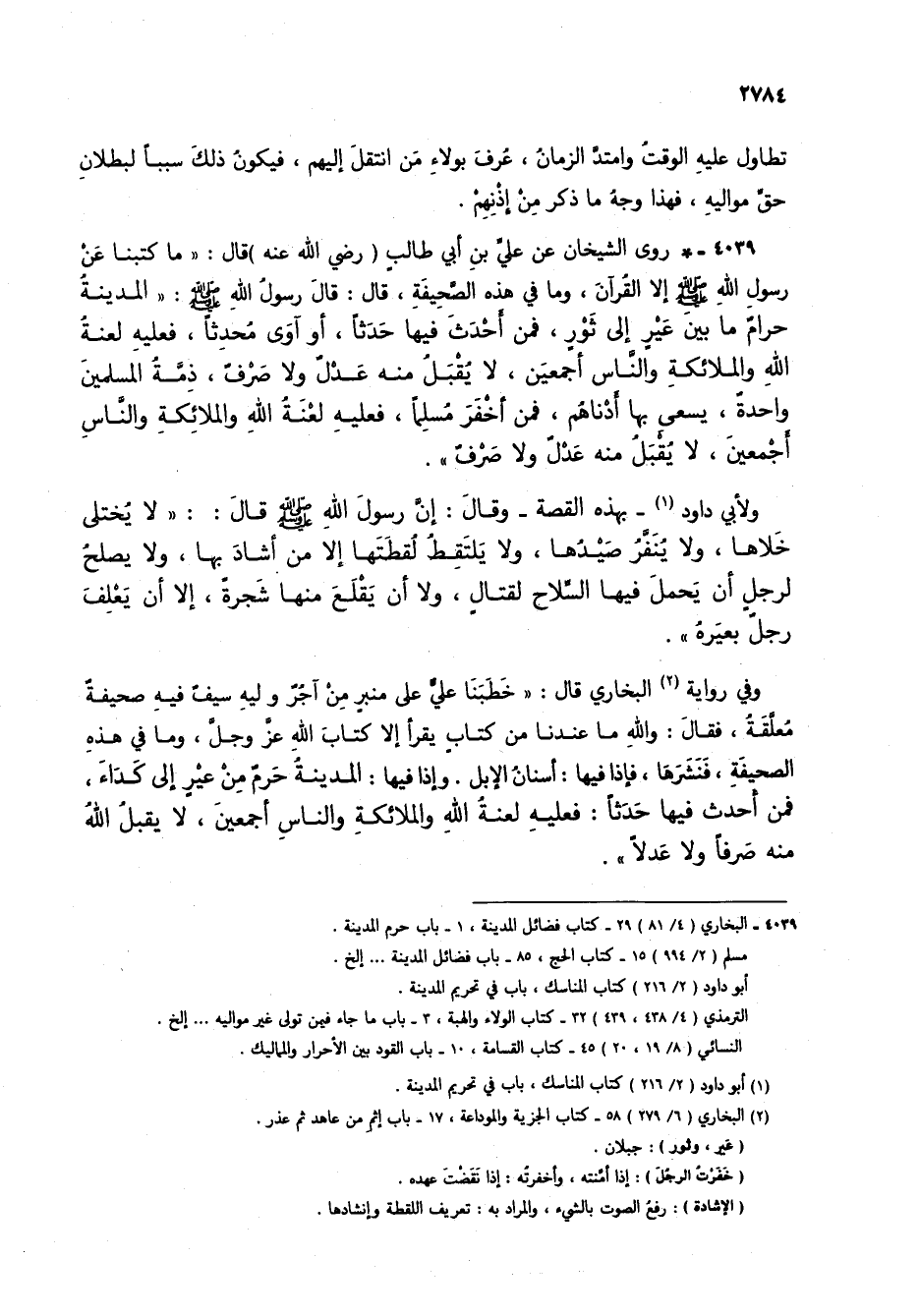 4039 - * روى الشيخان عن علي بن أبي طالب (رضي الله عنه) قال: "ما كتبنا عن رسول الله صلى الله عليه وسلم إلا القرآن، وما في هذه الصحيفة، قال: قال رسول الله صلى الله عليه وسلم: "المدينة حرام ما بين عير إلى ثور، فمن أحدث فيها حدثاً، أو آوى محدثاً، فعليه لعنة الله والملائكة والناس أجمعين، لا يقبل منه عدل ولا صرف، ذمة المسلمين واحدة، يسعى بها أدناهم، فمن أخفر مسلماً، فعليه لعنة الله والملائكة والناس أجمعين، لا يقبل منه عدل ولا صرف".