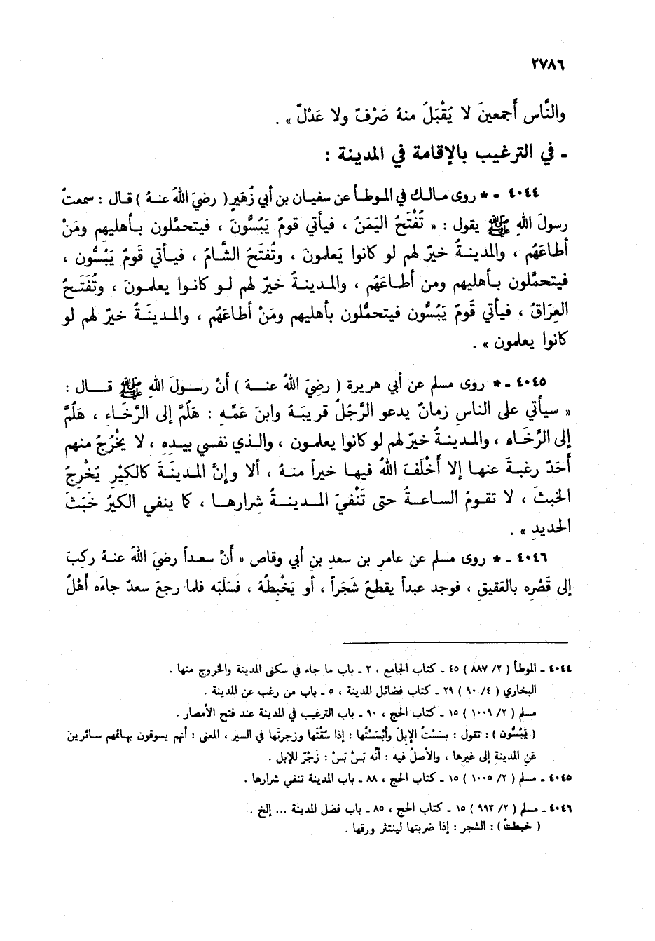 4044 - * روى مالك في الموطأ عن سفيان بن أبي زهير (رضي الله عنه) قال: سمعت رسول الله صلى الله عليه وسلم يقول: "تفتح اليمن، فيأتي قوم يبسون، فيتحملون بأهليهم ومن أطاعهم، والمدينة خير لهم لو كانوا يعلمون، وتفتح الشام، فيأتي قوم يبسون، فيتحملون بأهليهم ومن أطاعهم، والمدينة خير لهم لو كانوا يعلمون، وتفتح العراق، فيأتي قوم يبسون فيتحملون بأهليهم ومن أطاعهم، والمدينة خير لهم لو كانوا يعلمون".