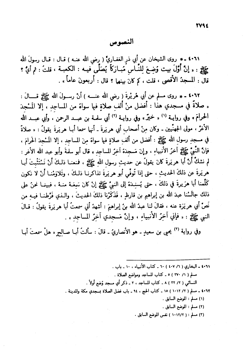 4062 - * روى مسلم عن أبي هريرة (رضي الله عنه) أن رسول الله صلى الله عليه وسلم قال: "صلاة في مسجدي هذا: أفضل من ألف صلاة فيما سواه من المساجد، إلا المسجد الحرام" وفي رواية (1) "خير" وفي رواية (2) أبي سلمة بن عبد الرحمن، وأبي عبد الله الأغر، مولى الجهنيين- وكان من أصحاب أبي هريرة- أنهما سمعا أبا هريرة يقول: "صلاة في مسجد رسول الله صلى الله عليه وسلم: أفضل من ألف صلاة فيما سواه من المساجد، إلا المسجد الحرام، فإن النبي صلى الله عليه وسلم آخر الأنبياء، وإن مسجده آخر المساجد" قال أبو سلمة وأبو عبد الله الأغر: لم نشك أن أبا هريرة كان يقول عن حديث رسول الله صلى الله عليه وسلم، فمنعنا ذلك أن نستثبت أبا هريرة عن ذلك الحديث، حتى إذا توفي أبو هريرة تذاكرنا ذلك، وتلاومنا أن لا نكون كلمنا أبا هريرة في ذلك، حتى يسنده إلى النبي صلى الله عليه وسلم إن كان سمعه منه، فبينما نحن على ذلك جالسنا عبد الله بن إبراهيم بن قارظ، فذكرنا ذلك الحديث، والذي فرطنا فيه من نص أبي هريرة عنه، فقال لنا عبد الله بن إبراهيم: أشهد أني سمعت أبا هريرة يقول: قال النبي صلى الله عليه وسلم: "فإني آخر الأنبياء، وإن مسجدي آخر المساجد".