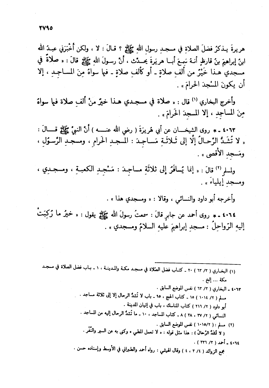 4063 - * روى الشيخان عن أبي هريرة (رضي الله عنه) أن النبي صلى الله عليه وسلم قال: "لا تشد الرحال إلا إلى ثلاثة مساجد: المسجد الحرام، ومسجد الرسول، ومسجد الأقصى".