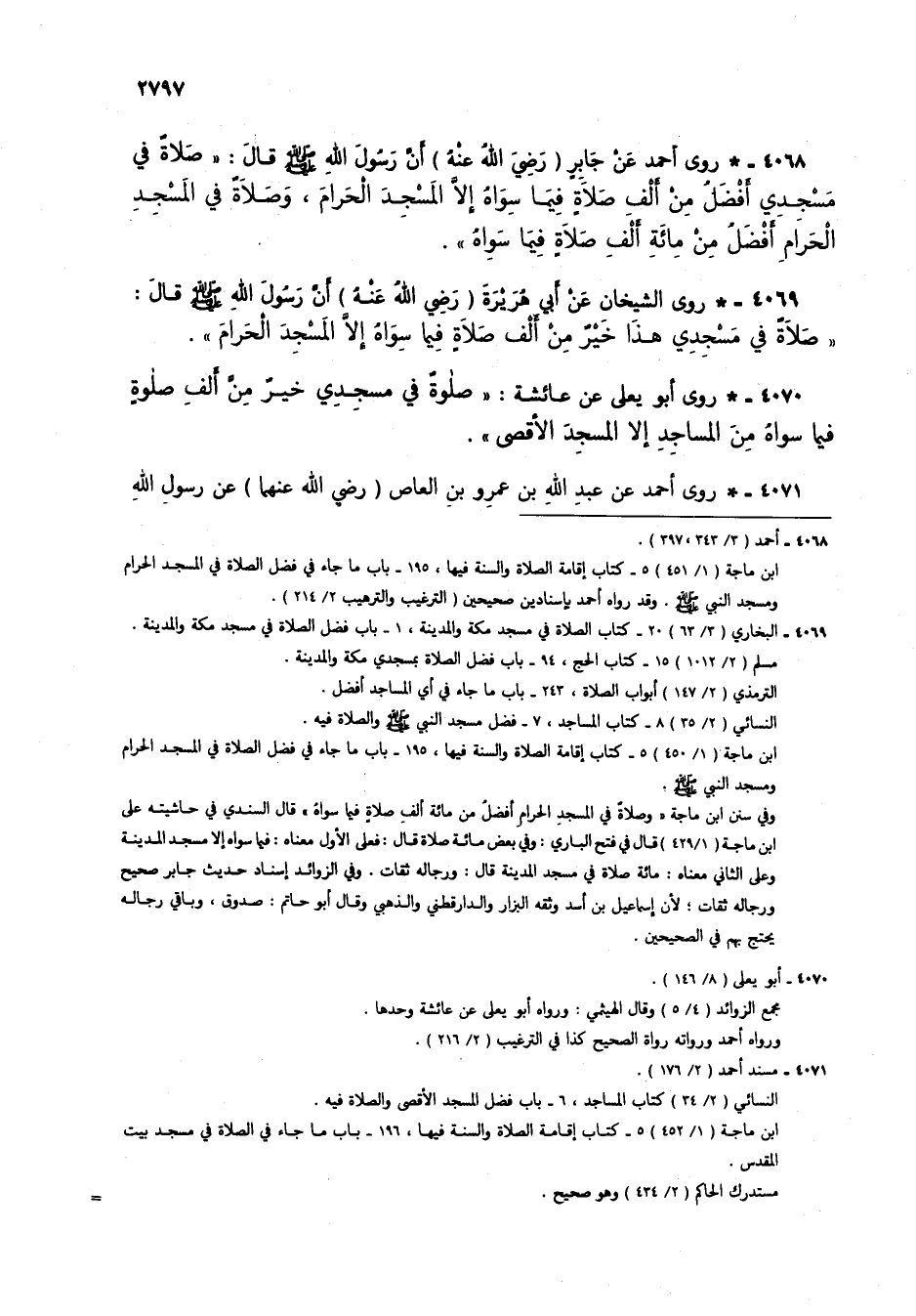 4068 - * روى أحمد عن جابر (رضي الله عنه) أن رسول الله صلى الله عليه وسلم قال: "صلاة في مسجدي أفضل من ألف صلاة فيما سواه إلا المسجد الحرام، وصلاة في المسجد الحرام أفضل من مائة ألف صلاة فيما سواه".