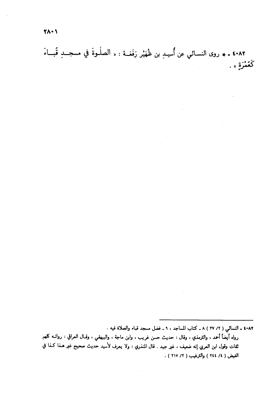 4082 - * روى النسائي عن أسيد بن ظهير رفعه: "الصلوة في مسجد قباء كعمرة".