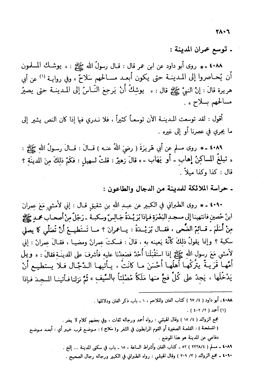4090 - * روى الطبراني في الكبير عن عبد الله بن شقيق قال: إني لأمشي مع عمران ابن حصين فانتهينا إلى مسجد البصرة فإذا بريدة جالس وسكبة- رجل من أصحاب محمد صلى الله عليه وسلم من أسلم- قائم الضحى، فقال بريدة: يا عمران؟ ما تستطيع أن تصلي كما يصلي سكبة؟ وإنما يقول ذلك كأنه يعينه به، قال: فسكت عمران ومضيا، فقال عمران: إني لأمشي مع رسول الله صلى الله عليه وسلم إذا استقبلنا أحد فصعدنا عليه فأشرف على المدينة فقال: "ويل أمها قرية يتركها أهلها أحسن ما كانت، يأتيها الدجال فلا يستطيع أن يدخلها، يجد على كل فج منها ملكاً مصلتاً بالسيف" ثم نزلنا فأتينا المسجد فإذا