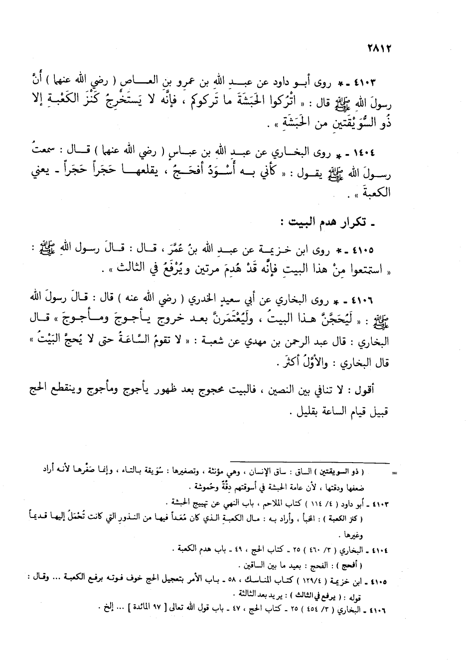 4104 - * روى البخاري عن عبد الله بن عباس (رضي الله عنهما) قال: سمعت رسول الله صلى الله عليه وسلم يقول: "كأني به أسود أفحج، يقلعها حجراً حجراً- يعني الكعبة".