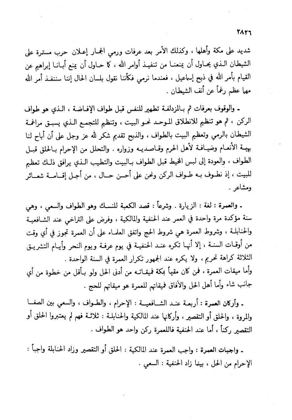 - والعمرة: لغة: الزيارة. وشرعاً: قصد الكعبة للنسك وهو الطواف والسعي، وهي سنة مؤكدة مرة واحدة في العمر عند الحنفية والمالكية، وفرض على التراخي عند الشافعية والحنابلة، وشروط العمرة هي شروط الحج واتفق العلماء على أن العمرة تجوز في أي وقت من أوقات السنة، إلا أنها تكره عند الحنفية في يوم عرفة ويوم النحر وأيام التشريق الثلاثة كراهة تحريم، ولا يكره عند الجمهور تكرار العمرة في السنة الواحدة.
