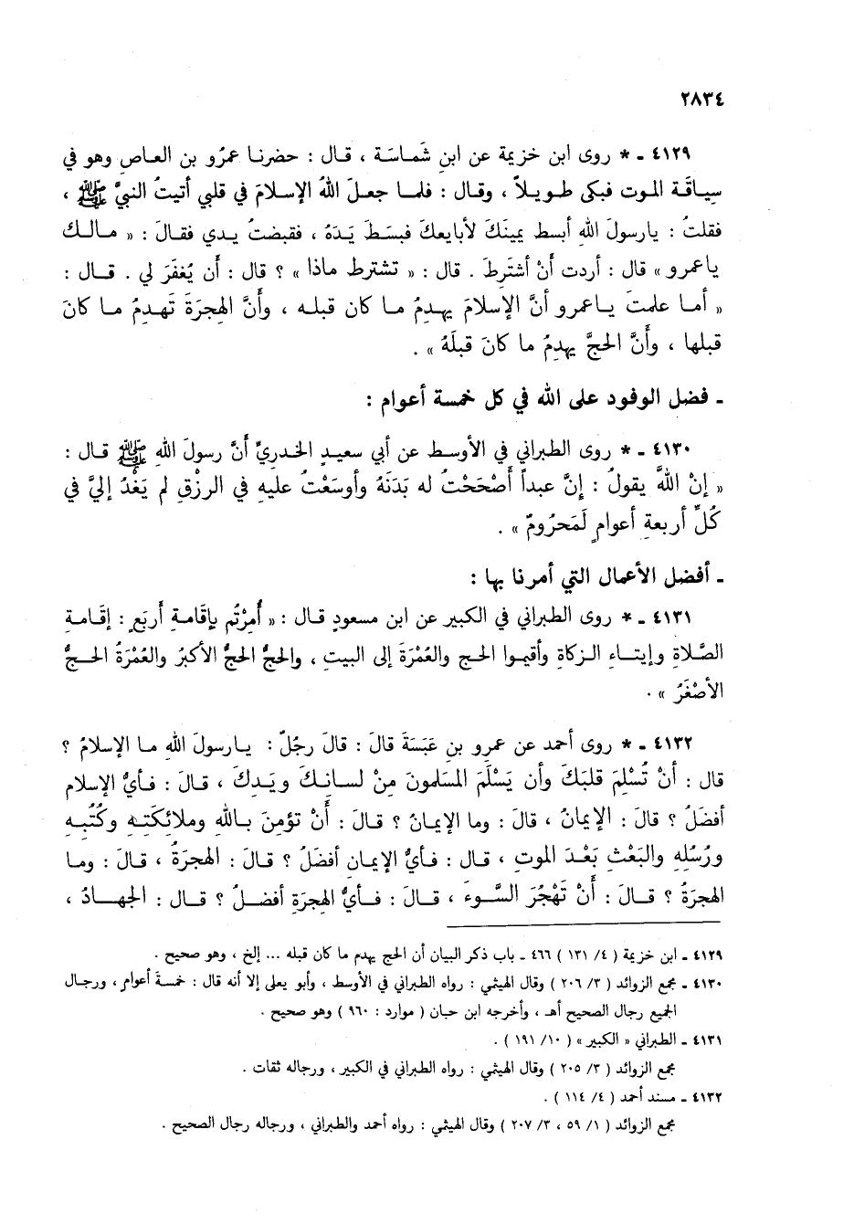 4129 - * روى ابن خزيمة عن ابن شماسة، قال: حضرنا عمرو بن العاص وهو في سياقة الموت فبكى طويلاً، وقال: فلما جعل الله الإسلام في قلبي أتيت النبي صلى الله عليه وسلم، فقلت: يا رسول الله أبسط يمينك لأبايعك فبسط يده، فقبضت يدي فقال: "مالك يا عمرو" قال: أردت أن أشترط. قال: "تشترط ماذا"؟ قال: أن يغفر لي. قال: "أما علمت يا عمرو أن الإسلام يهدم ما كان قبله، وأن الهجرة تهدم ما كان قبلها، وأن الحج يهدم ما كان قبله".