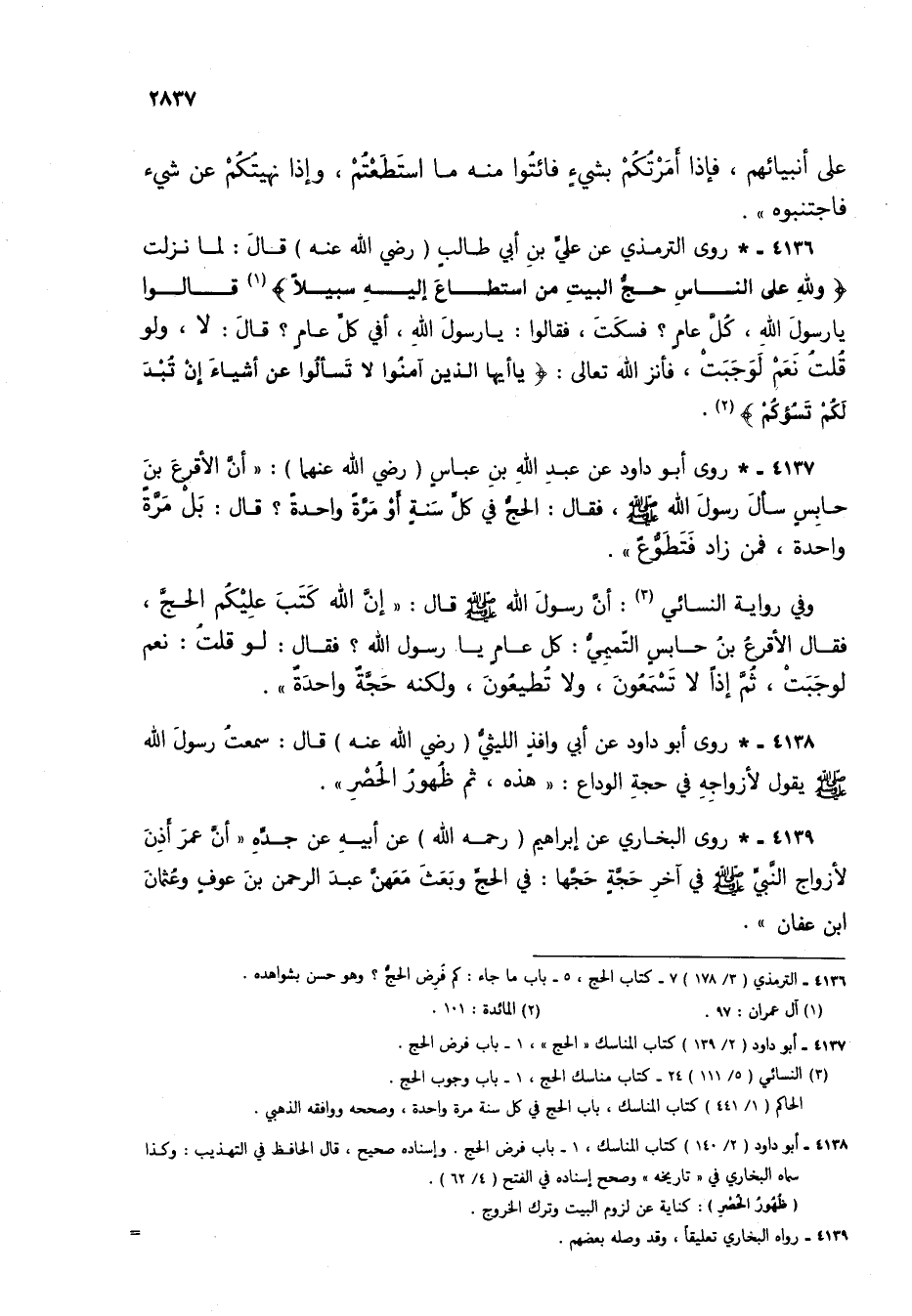 4137 - * روى أبو داود عن عبد الله بن عباس (رضي الله عنهما): "أن الأقرع بن حابس سأل رسول الله صلى الله عليه وسلم، فقال: الحج في كل سنة أو مرة واحدة؟ قال: بل مرة واحدة، فمن زاد فتطوع".