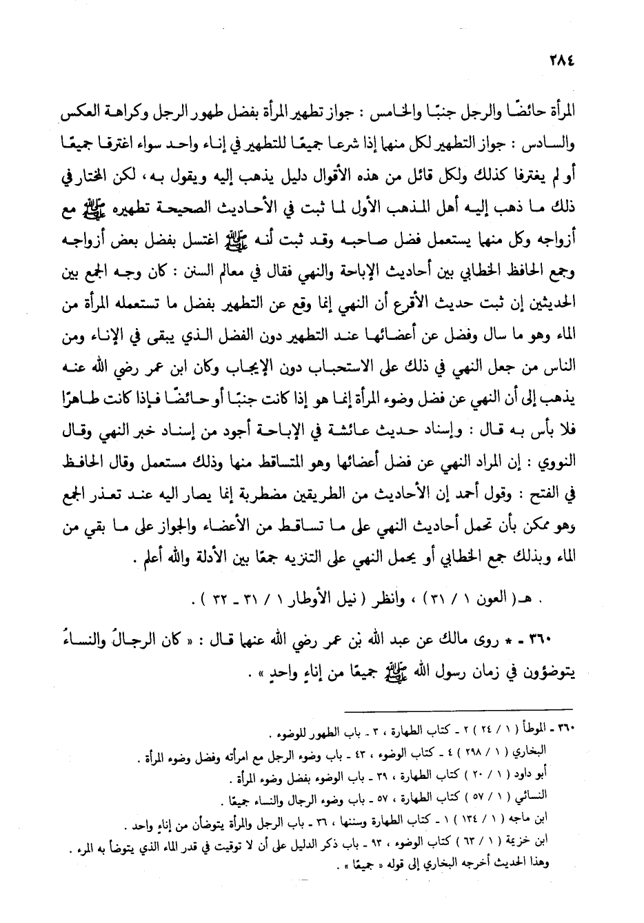 360 - * روى مالك عن عبد الله بن عمر رضي الله عنهما قال: "كان الرجالُ والنساءُ يتوضؤون في زمان رسول الله صلى الله عليه وسلم جميعاً من إناءٍ واحدٍ".