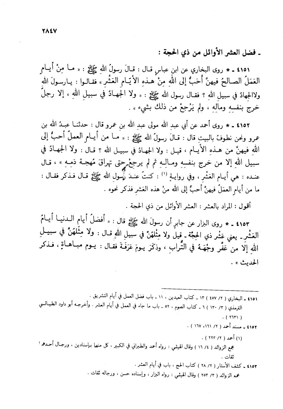 4152 - * روى أحمد عن أبي عبد الله مولى عبد الله بن عمرو قال: حدثنا عبد الله بن عمرو ونحن نطوف بالبيت قال: قال رسول الله صلى الله عليه وسلم: "ما من أيام العمل أحب إلى الله فيهن من هذه الأيام، قيل: ولا الجهاد في سبيل الله؟ قال: ولا الجهاد في سبيل الله إلا من خرج بنفسه وماله ثم لم يرجع حتى تهراق مهجة دمه"، قال عنده: هي أيام العشر، وفي رواية (1): كنت عند رسول الله صلى الله عليه وسلم قال فذكر فقال: ما من أيام العمل فيهن أحب إلى الله من هذه العشر فذكر نحوه.