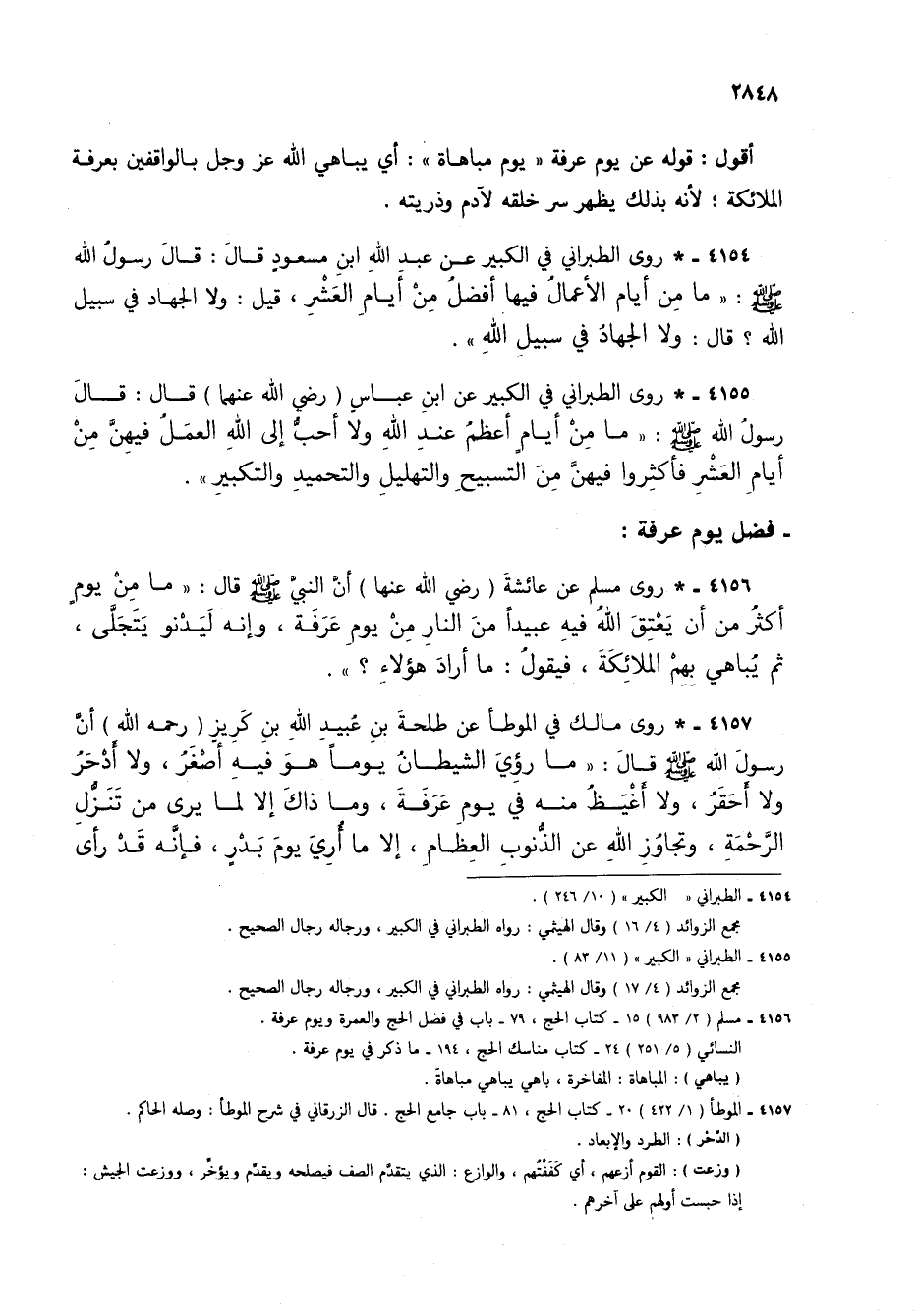 4156 - * روى مسلم عن عائشة (رضي الله عنها) أن النبي صلى الله عليه وسلم قال: "ما من يوم أكثر من أن يعتق الله فيه عبيداً من النار من يوم عرفة، وإنه ليدنو يتجلى، ثم يباهي بهم الملائكة، فيقول: ما أراد هؤلاء؟ ".