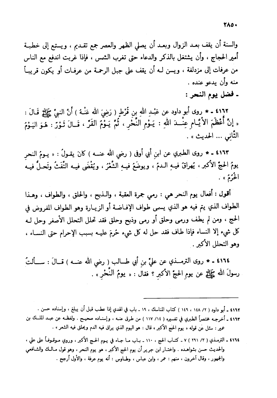 4163 - * روى الطبراني عن ابن أبي أوفى (رضي الله عنه) كان يقول: "يوم النحر يوم الحج الأكبر، يهراق فيه الدم، ويوضع فيه الشعر، ويقضى فيه التفث وتحل فيه الحرم".
