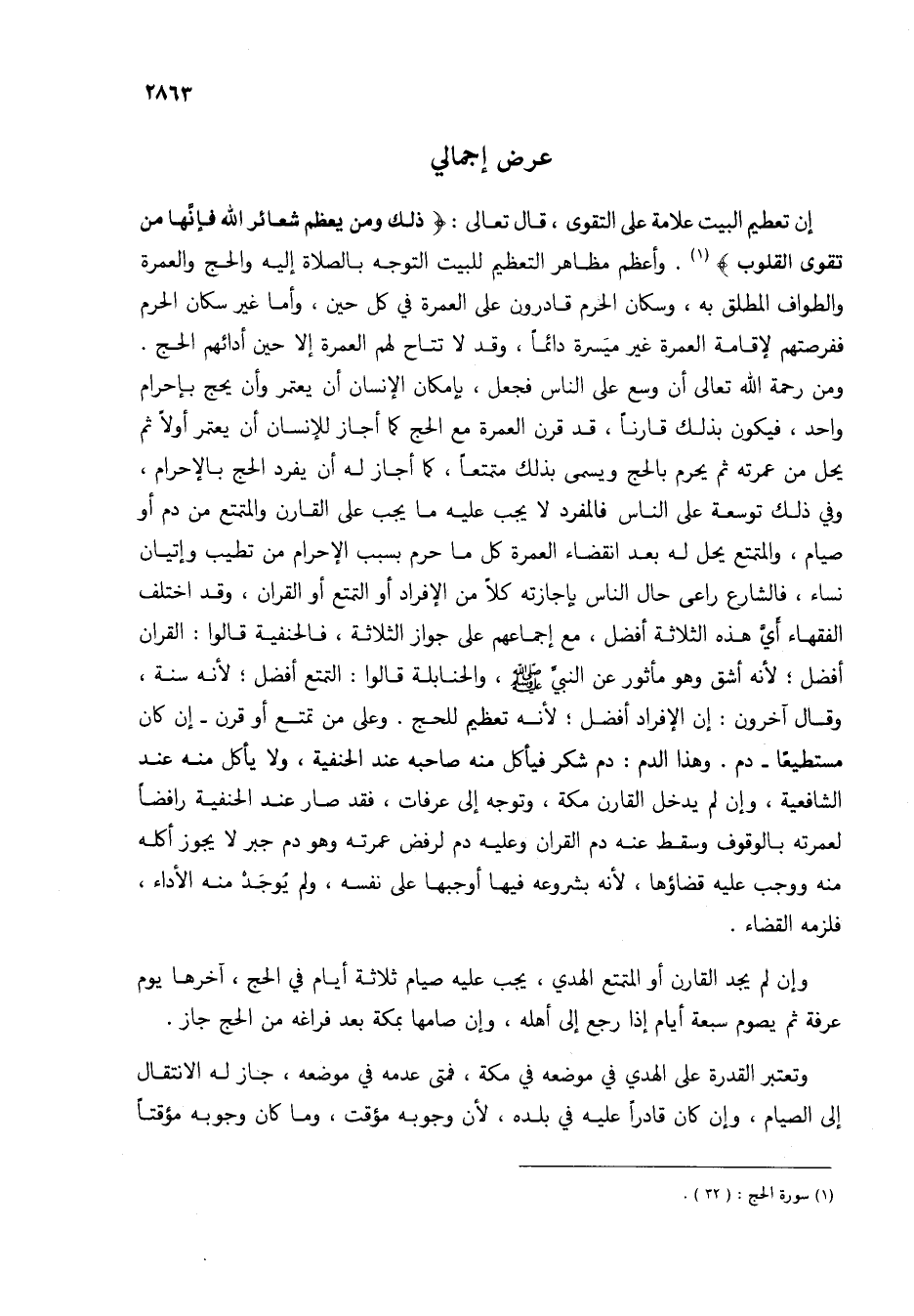 إن تعظيم البيت علامة على التقوى، قال تعالى: {ذَلِكَ وَمَنْ يُعَظِّمْ شَعَائِرَ اللَّهِ فَإِنَّهَا مِنْ تَقْوَى الْقُلُوبِ} (1). وأعظم مظاهر التعظيم للبيت التوجه بالصلاة إليه والحج والعمرة والطواف المطلق به، وسكان الحرم قادرون على العمرة في كل حين، وأما غير سكان الحرم ففرصتهم لإقامة العمرة غير ميسرة دائماً، وقد لا تتاح لهم العمرة إلا حين أدائهم الحج. ومن رحمة الله تعالى أن وسع على الناس فجعل، بإمكان الإنسان أن يعتمر وأن يحج بإحرام واحد، فيكون بذلك قارناً، قد قرن العمرة مع الحج كما أجاز للإنسان أن يعتمر أولاً ثم يحل من عمرته ثم يحرم بالحج ويسمى بذلك متمتعاً، كما أجاز له أن يفرد الحج بالإحرام، وفي ذل توسعة على الناس فالمفرد لا يجب عليه ما يجب على القارن والمتمتع من دم أو صيام، والمتمتع يحل له بعد انقضاء العمرة كل ما حرم بسبب الإحرام من تطيب وإتيان نساء، فالشارع راعى حال الناس بإجازته كلاً من الإفراد أو التمتع أو القران، وقد اختلف الفقهاء أي هذه الثلاثة أفضل، مع إجماعهم على جواز الثلاثة، فالحنفية قالوا: القران أفضل؛ لأنه أشق وهو مأثور عن النبي صلى الله عليه وسلم، والحنابلة قالوا: التمتع أفضل؛ لأنه سنة، وقال آخرون: إن الإفراد أفضل؛ لأنه تعظيم للحج. وعلى من تمتع أو قرن- إن كان مستطيعاً- دم. وهذا الدم: دم شكر فيأكل منه صاحبه عند الحنفية، ولا يأكل منه عند الشافعية، وإن لم يدخل القارن مكة، وتوجه إلى عرفات، فقد صار عندا لحنفية رافضاً لعمرته بالوقوف وسقط عنه دم القران وعليه دم لرفض عمرته وهو دم جبر لا يجوز أكله منه ووجب عليه قضاؤها، لأنه بشروعه فيها أوجبها على نفسه، ولم يوجد منه الأداء، فلزمه القضاء.