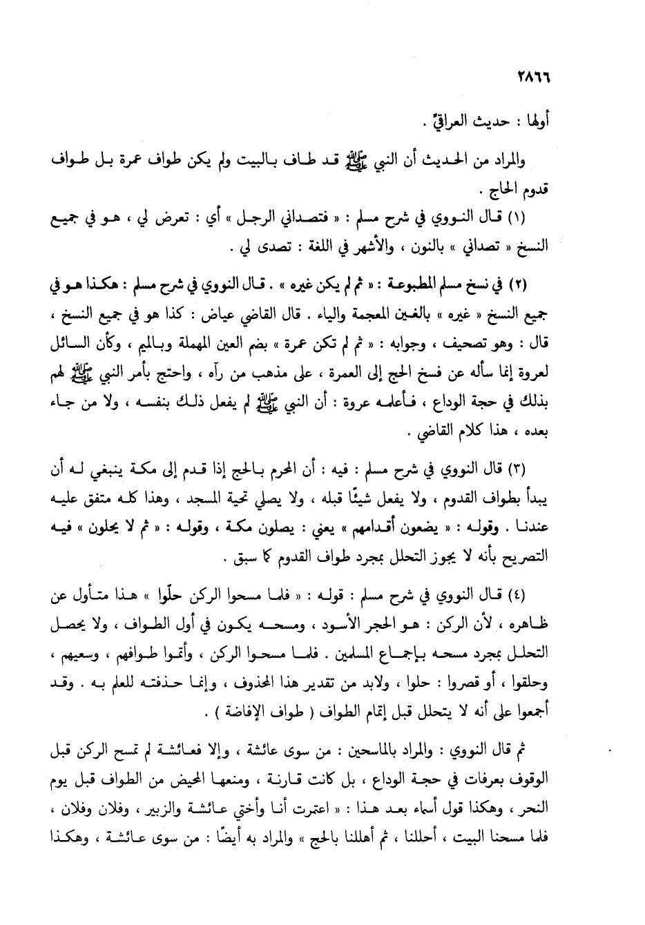 (4) قال النووي في شرح مسلم: قوله: "فلما مسحوا الركن حلوا" هذا متأول عن ظاهره، لأن الركن: هو الحجر الأسود، ومسحه يكون في أول الطواف، ولا يحصل التحلل بمجرد مسحه بإجماع المسلمين. فلما مسحوا الركن، وأتموا طوافهم، وسعيهم، وحلقوا، أو قصروا: حلوا، ولابد من تقدير هذا المحذوف، وإنما حذفته للعلم به. وقد أجمعوا على أنه لا يتحلل قبل إتمام الطواف (طواف الإفاضة).