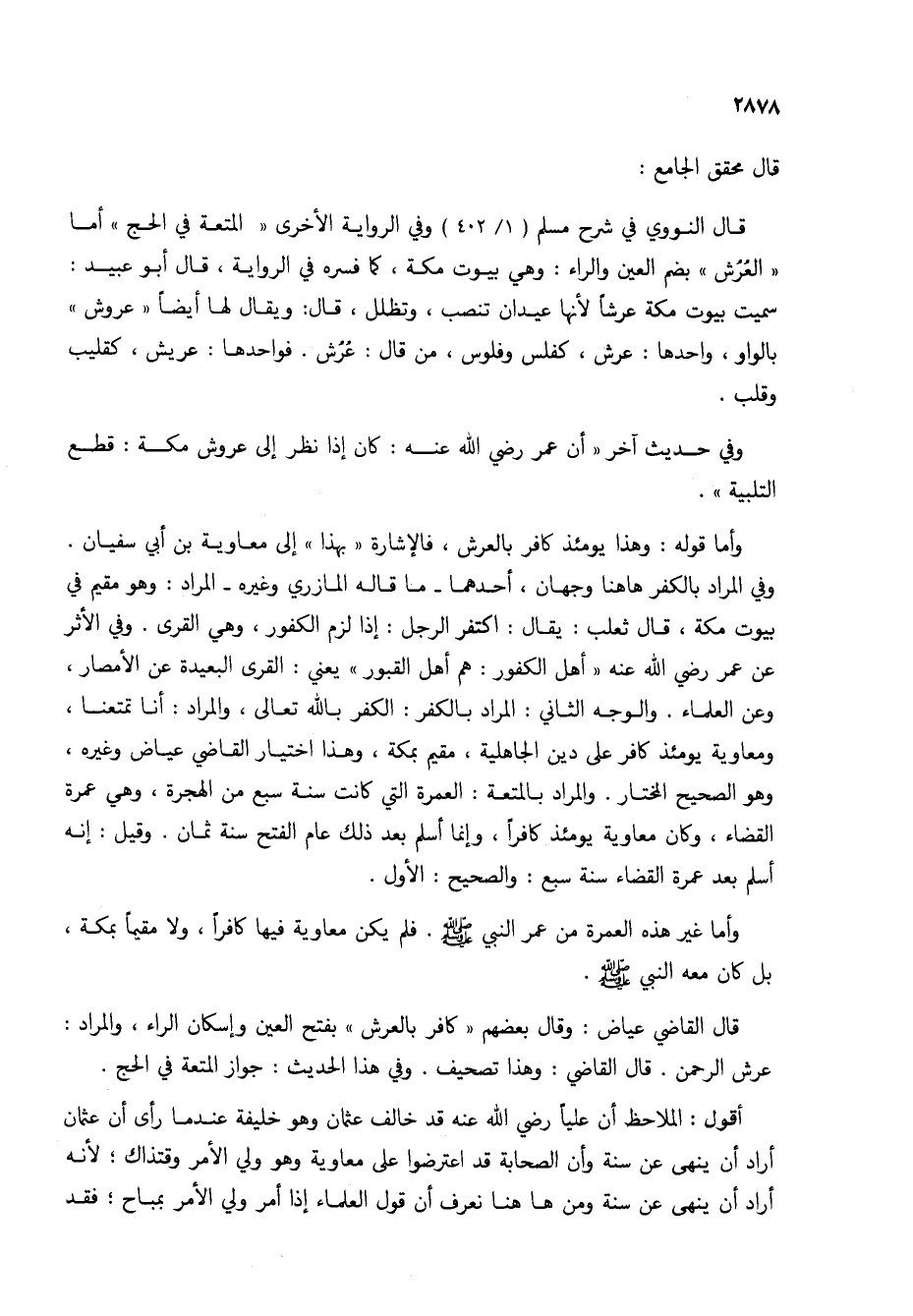 قال النووي في شرح مسلم (1/ 402) وفي الرواية الأخرى "المتعة في الحج" أما "العرش" بضم العين والراء: وهي بيوت مكة، كما فسره في الرواية، قال أبو عبيد: سميت بيوت مكة عرشاً لأنها عيدان تنصب، وتظلل، قال: ويقال لها أيضاً "عروش" بالواو، واحدها: عرش، كفلس وفلوس، من قال: عرش. فواحدها: عريش، كقليب وقلب.