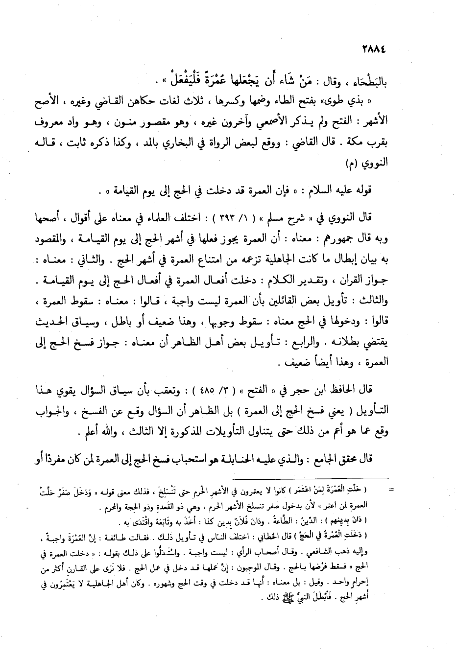 قال الحافظ ابن حجر في "الفتح" (3/ 485): وتعقب بأن سياق السؤال يقوي هذا التأويل (يعني فسخ الحج إلى العمرة) بل الظاهر أن السؤال وقع عن الفسخ، والجواب وقع عما هو أعم من ذلك حتى يتناول التأويلات المذكورة إلا الثالث، والله أعلم.